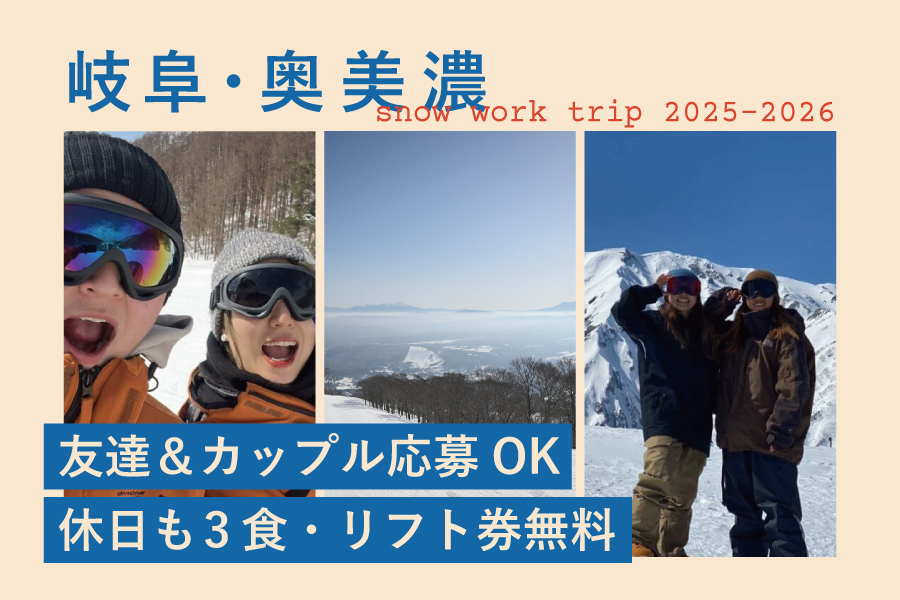お気に入り \23時までナイターあり◎滑りまくる冬/岐阜のゲレンデでインフォメーション 岐阜県/奥美濃 インフォメーション・売店 時給1,200円 12月上旬~2,3ヶ月程度 2月上旬~3月末以上 ★フルシーズン大歓迎 寮写真あり個室寮WiFiあり友人OK出会いアットホーム無料リフト券・レンタルあり学生歓迎初心者向け食費無料交通費支給 【休日も3食無料】【ペア応募OK】【Wi-Fi完備個室寮】西日本最大級のゲレンデで仕事もオフ… 詳しく見る 選択する