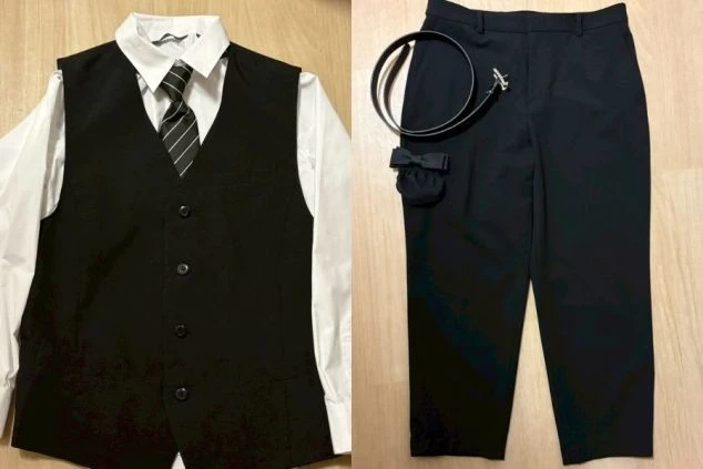 黒スラックス/べルト/黒革靴(厚底等NG)/白色無地カッターシャツ